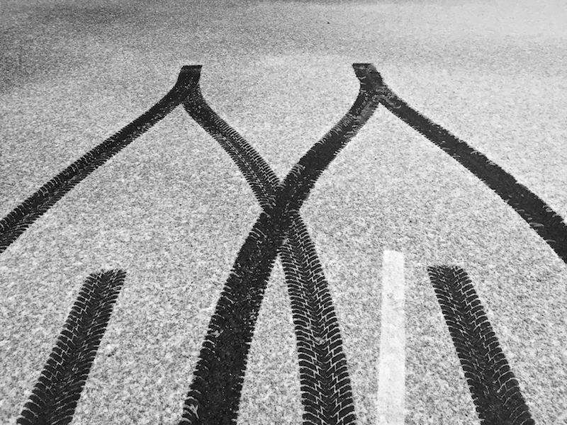 dag 6 - egenproducerade bilspår på flit gjorda med ett vitt streck som söndrar symmetrin. alltid kan det störa nån symmetrifanatiker. mig stör det något otroligt.